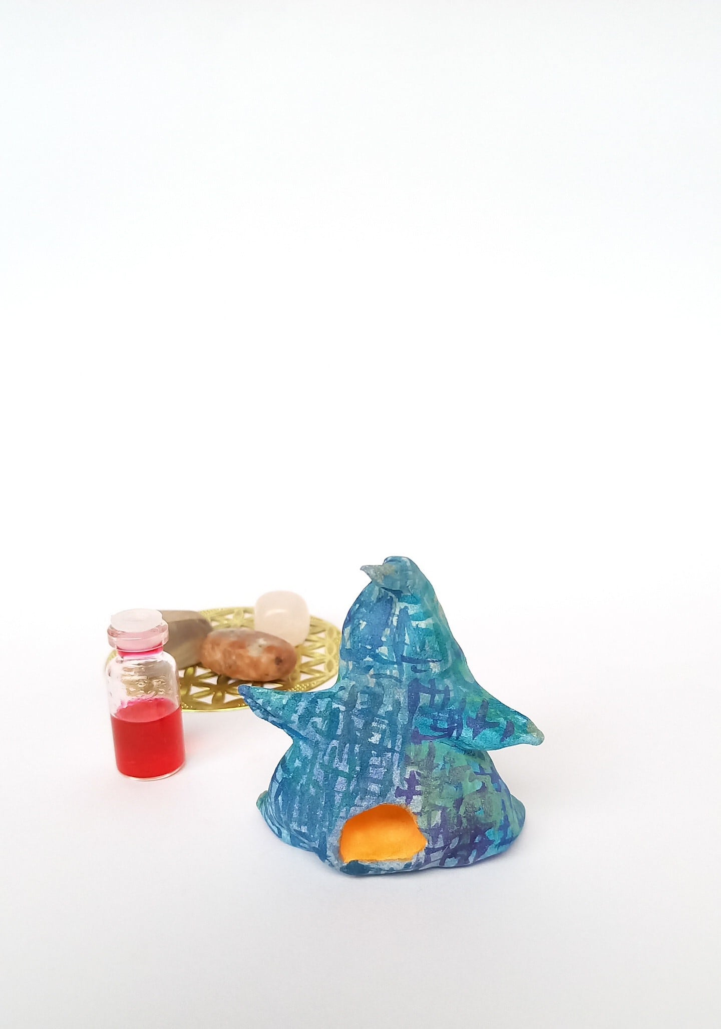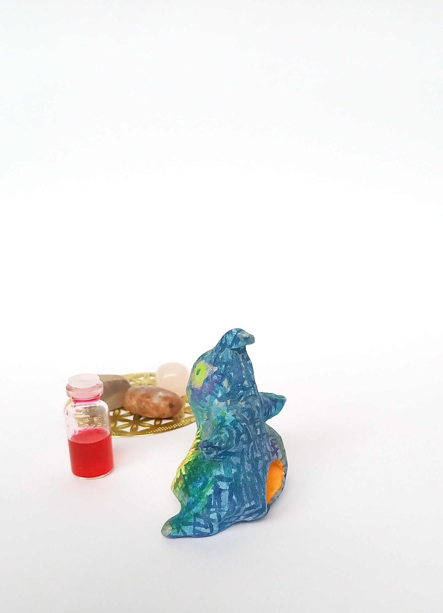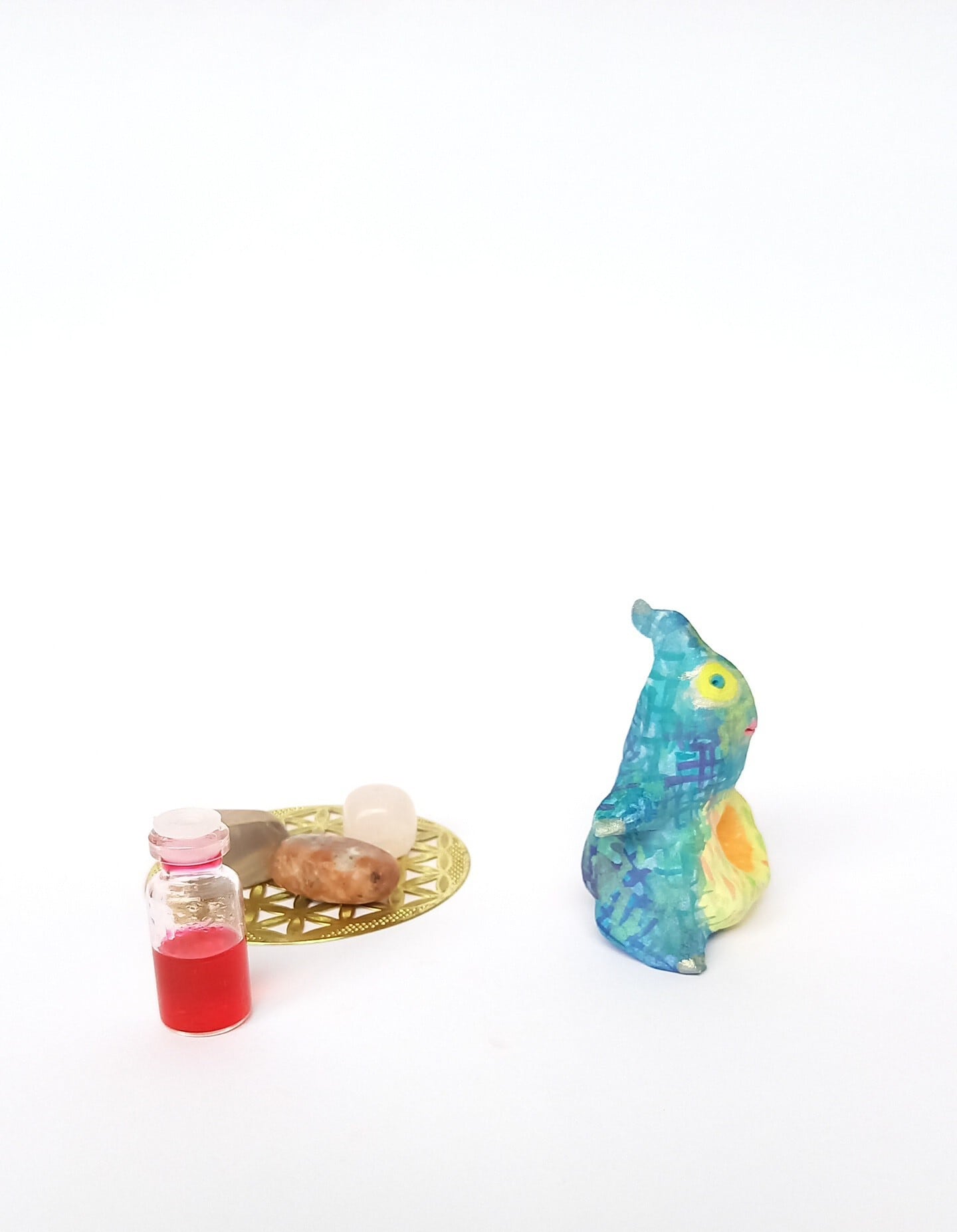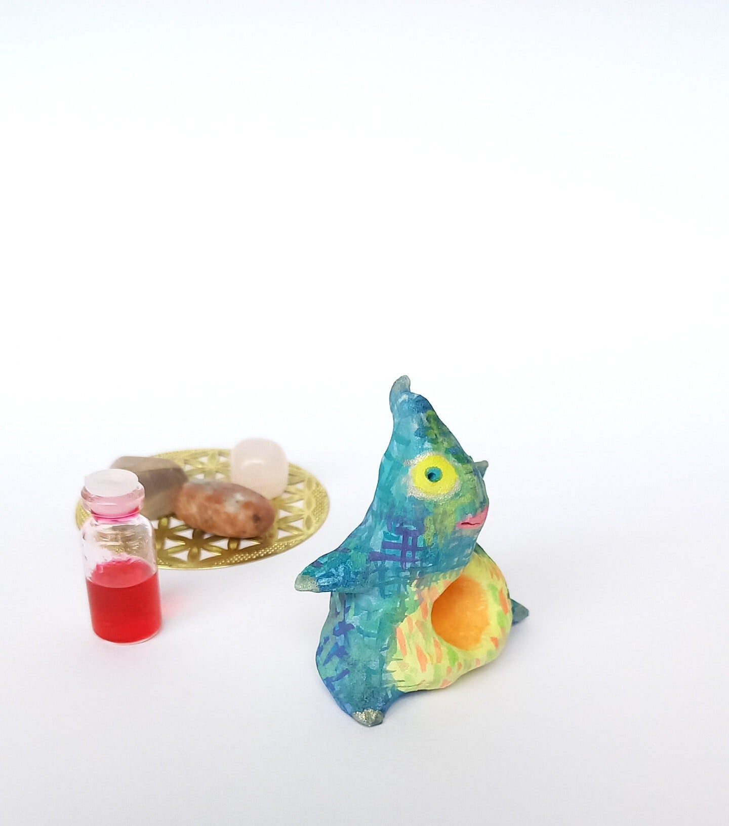 石粉粘土で成形し、水彩絵具で着彩後、ニスを塗布しています。