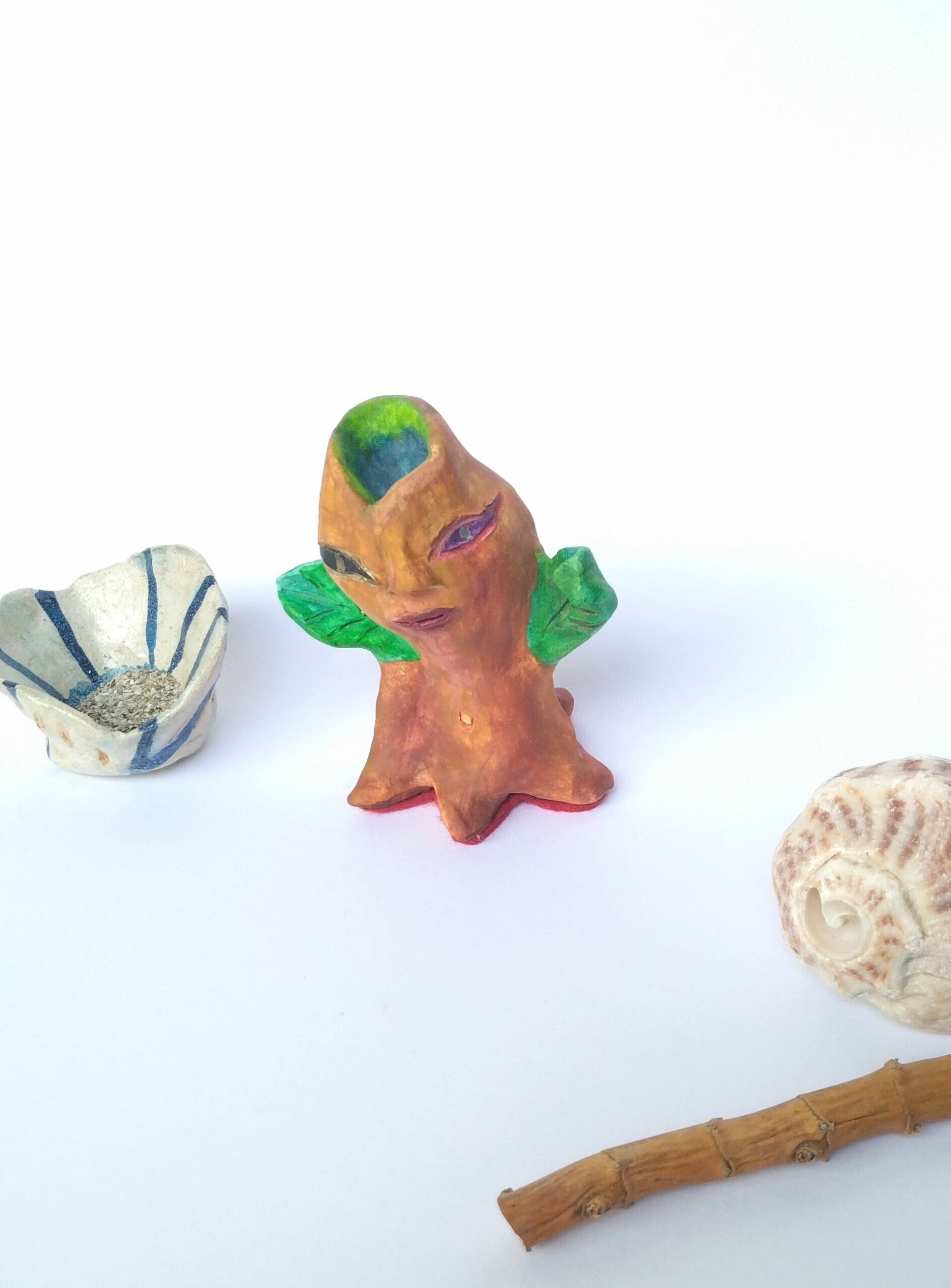 石粉粘土に顔彩絵具で着彩、仕上げには色止めのスプレーを塗布しています。