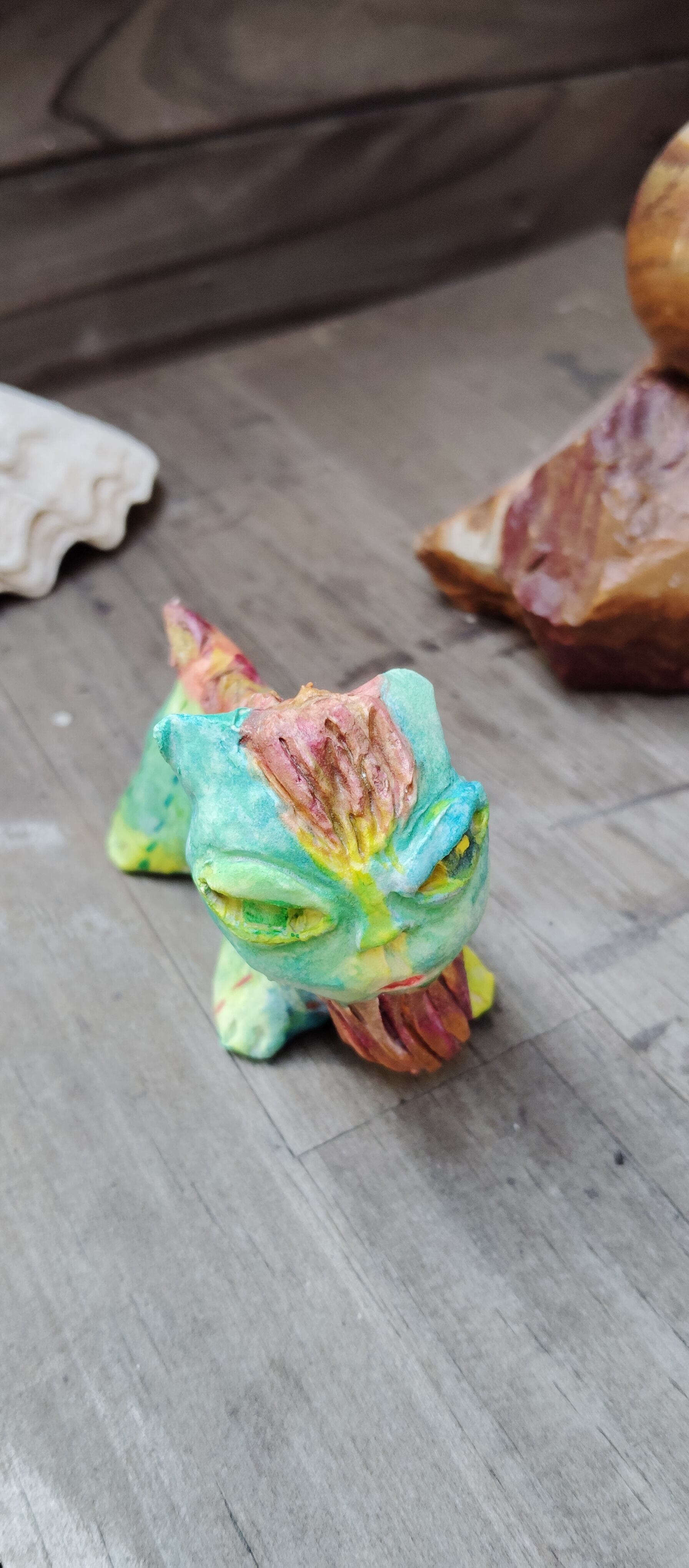 石粉粘土に顔彩絵の具で着採してから粘土用ラッカーを塗っています。